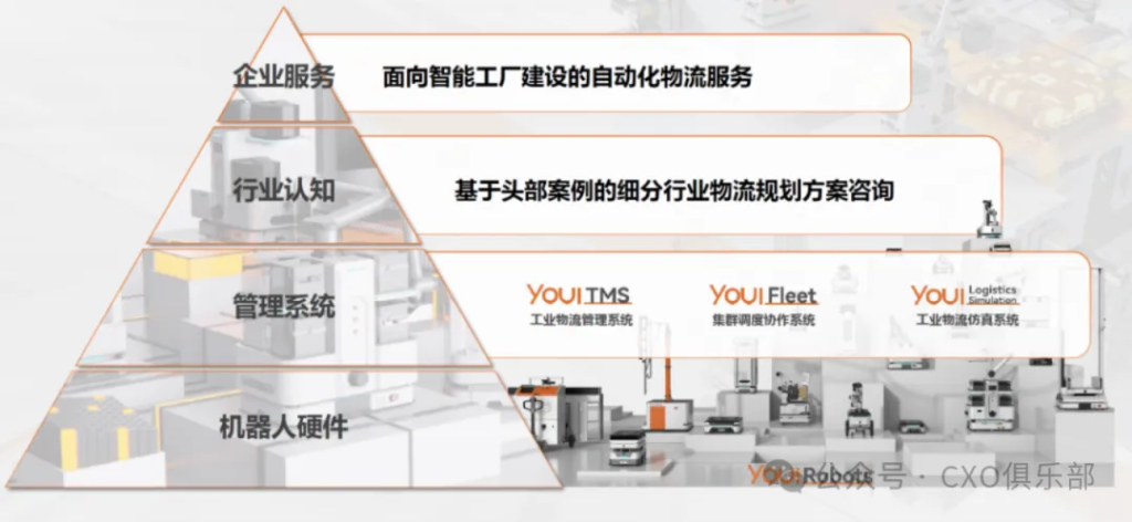 通过构建一套完整的价值金字塔,优艾智合机器人在智能工厂领域实现了从硬件到软件的全方位解决方案,如图9所示。最初,优艾公司致力于通过机器人硬件解决各种问题。然而,由于认识到单纯的硬件解决方案无法完全实现智能工厂的全部价值,因此后面开发了管理系统、控制系统和调度系统,其中包括Fleet系统和TMS场内物流管控系统。随着在不同行业的实践经验不断积累,我们逐渐形成了针对头部客户的通用细分行业物流规划方案,并为更多智能工厂建设提供了宝贵的参考。现在,许多客户在项目初期就将这一套解决方案与其智能工厂进行了整合。