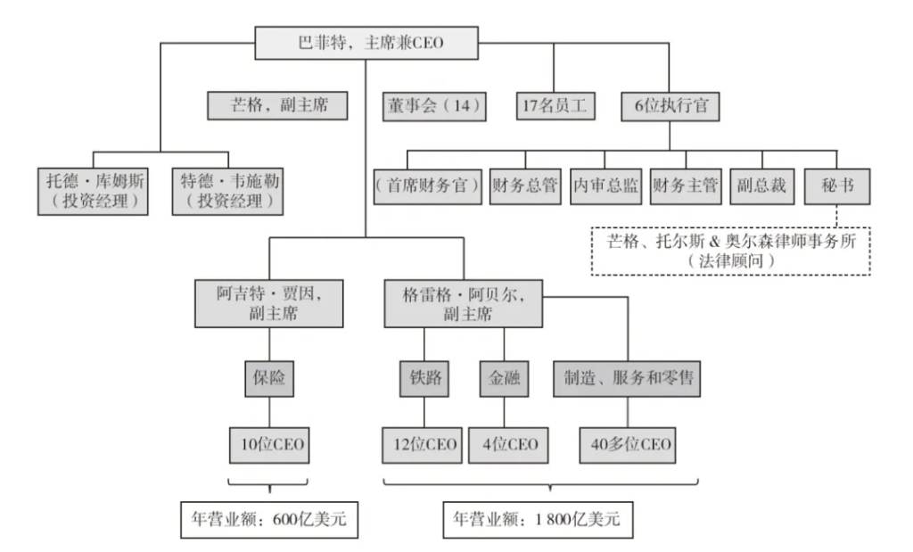 对伯克希尔·哈撒韦子公司财务相关事务的正式监督,主要是由奥马哈的五位执行官负责:首席财务官、财务总管、内审总监、财务主管和财务副总裁。唯一的其他类执行官就是公司的秘书,类似法律总顾问,但主要是由外部律师团队组成的,负责监督处理伯克希尔·哈撒韦的收购和债券工作。