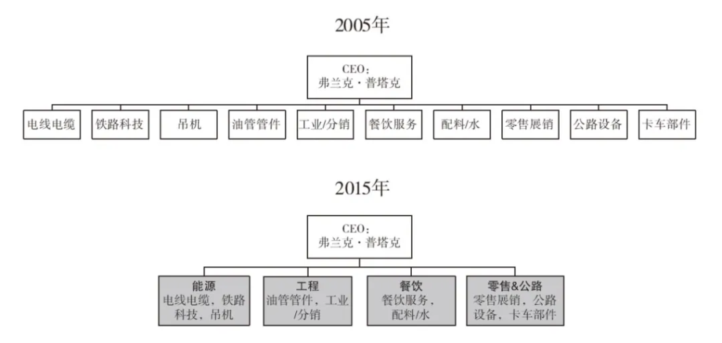 这意味着不断把职能下放到各级子公司;推行分而治之,进一步拆分被收购的公司;以及分别汇报,不断扩大高级管理层的责任范围。
