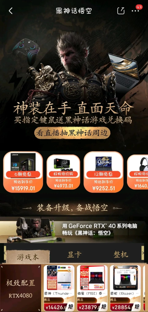 更直观的是,这些3C数码厂商迎来了一次大为可观的销售热潮。致态的联名款固态硬盘成交额环比增长超100%;游戏显卡整体成交金额同比增长超200%,其中七彩虹联名显卡已售罄;游戏手柄成交量同比增长超6倍,黑神话联名游戏手柄累计售出超5万只,其中飞智八爪鱼4《黑神话:悟空》联名款开售1分钟成交量破万,八位堂《黑神话:悟空》联名款开售当天成交量超3万只。