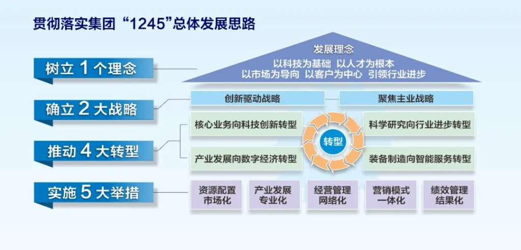 确立“1245”总体发展思路,凝聚数字化转型发展共识。2018年中国煤科通过“十三五”规划修编确立了“1245”总体发展思路,为集团公司的发展明确了方向。结合“十四五”规划的编制,中国煤科进一步深入学习习近平总书记关于国企改革发展、数字化转型的指示批示精神,深度思考集团公司未来的发展路径,将“1245”深化为“树立‘以科技为基础,以人才为根本,以市场为导向,以客户为中心,引领行业进步’一个发展理念,确立‘创新驱动、聚焦主业’两大战略,推动‘核心业务向科技创新转型、科学研究向行业进步转型、产业发展向数字经济转型、装备制造向智能服务转型’四大转型,实施‘资源配置市场化、产业发展专业化、经营管理网络化、营销模式一体化、绩效管理结果化’五大举措”,更加适应时代变革,更加凸显数字化转型对中国煤科实现“建设具有全球竞争力的世界一流科技创新型企业”愿景的重要性,已在集团公司形成高度共识。