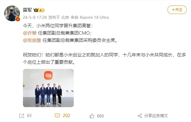 凤凰网科技讯 (作者/杨睿琪)5月8日,小米公司发布组织调整及干部任命通知:许斐、张剑慧晋升为小米集团高管。其中,许斐任集团副总裁兼集团CMO;张剑慧任集团副总裁兼集团采购委员会主席。