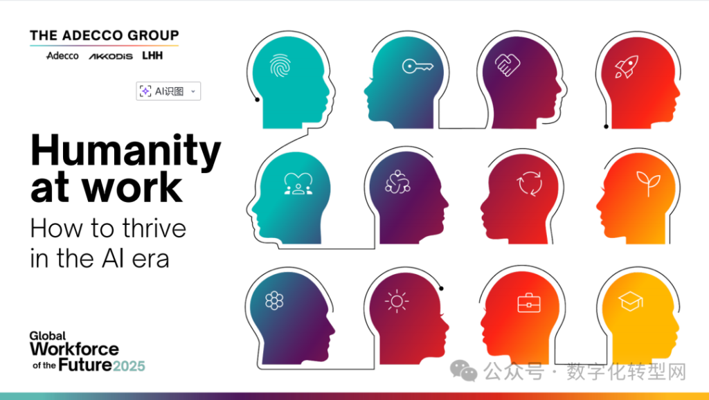 近日,德科集团发布第六份《未来全球劳动力报告》,报告主题为 “职场人:如何在人工智能时代茁壮成长”(Humanity at Work: How to thrive in the AI era)。《2025未来全球劳动力报告》深入剖析人工智能、工作使命感与人际联结对职场形态的重塑作用,并针对劳动力转型背景下,企业管理者应采取何种策略跟上变革节奏给出方向。