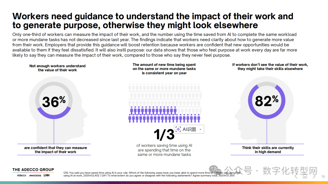但现实是,仅有 36% 的劳动者能自信地衡量自身工作的影响,仍有三分之一的人将 AI 节省的时间用于重复或乏味的任务,这一比例与去年持平。