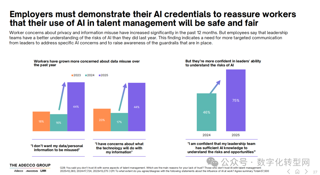 同时,劳动者对数据隐私的担忧显著上升,2025 年有 44% 的人担心个人数据被滥用,较往年明显增加,这要求雇主必须通过明确的框架和保障措施缓解焦虑。