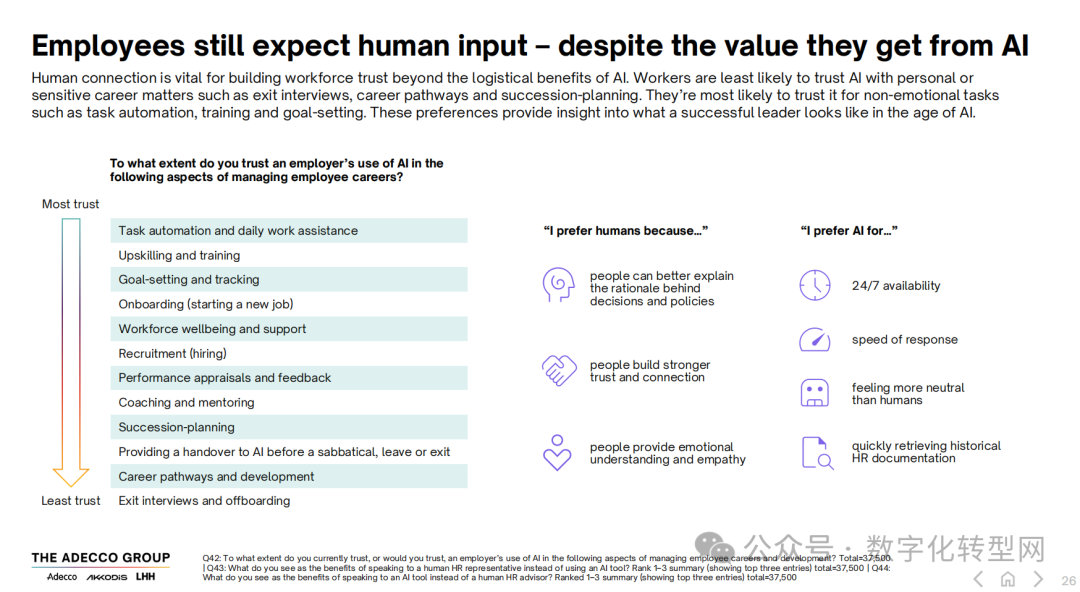 劳动者对AI的信任边界清晰:最信任AI处理任务自动化、培训、目标设定等非情感类工作;最不信任其参与离职面谈、职业路径规划、继任计划等涉及个人敏感事务的场景。
