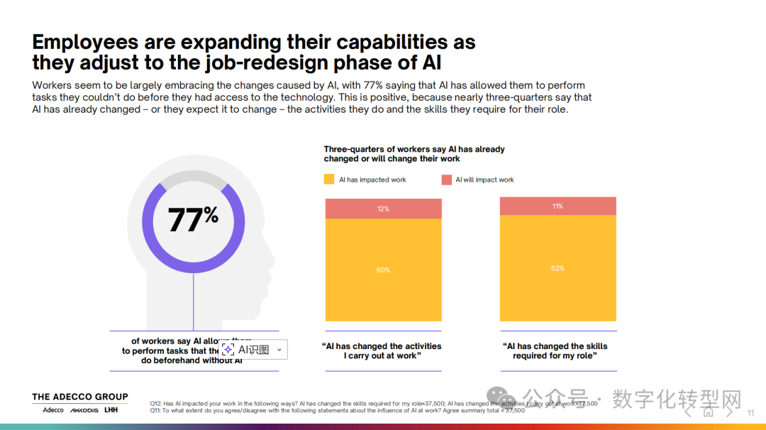 更值得关注的是,77% 的劳动者表示 AI 让他们能够完成以往无法实现的任务,近四分之三的人承认AI已改变或即将改变工作内容与所需技能。