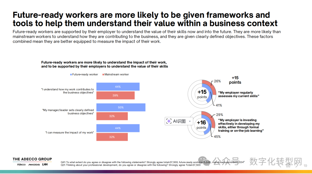 “未来就绪型劳动者”(约占总劳动力的 37%,较 2024 年的 11% 大幅增长)在这一维度表现突出。他们更易获得雇主提供的高价值工作指导,44% 能清晰理解自身工作对业务目标的贡献(普通劳动者为 39%),44% 可衡量工作影响(普通劳动者为 32%),且有 42% 计划主动掌控技能发展(普通劳动者为 30%)。这表明,清晰的价值感知是驱动技能升级的关键。https://wxa.wxs.qq.com/tmpl/ov/base_tmpl.html