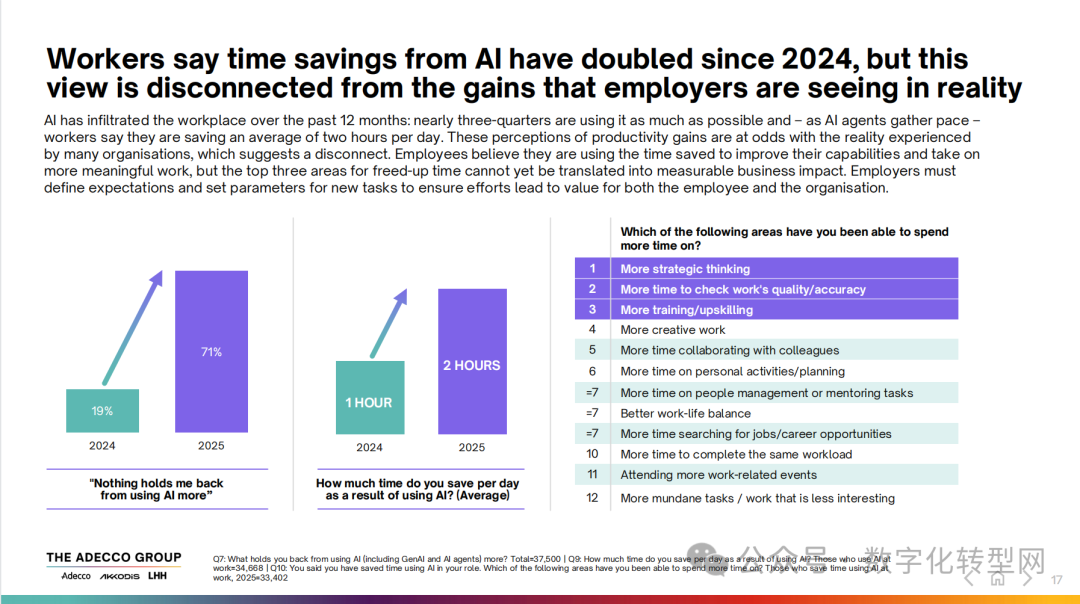 AI 带来的效率提升已成为共识,但劳动者感知与企业实际收益之间存在明显脱节。2025年,劳动者平均每天通过AI节省2小时,较2024年的1小时实现翻倍;且71% 的人表示 “没有因素阻碍自己更多使用 AI”,较 2024年的19%大幅提升。