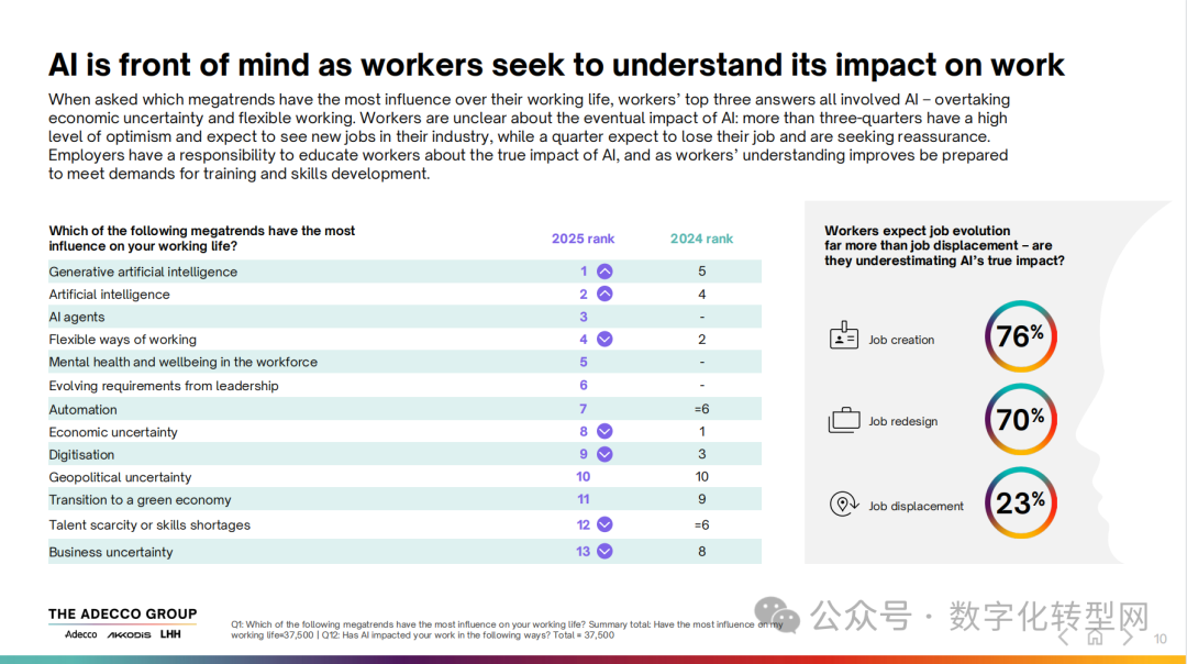 AI 已深度融入职场,成为影响劳动者工作生活的首要趋势。报告显示,AI 相关趋势占据职场影响因素前三甲 —— 生成式人工智能(2025年排名第1,2024年第 5)、人工智能(2025年第2,2024年第4)、AI Agents(2025年第3,2024年未上榜),远超经济不确定性(2025年第8,2024年第1)等传统议题。