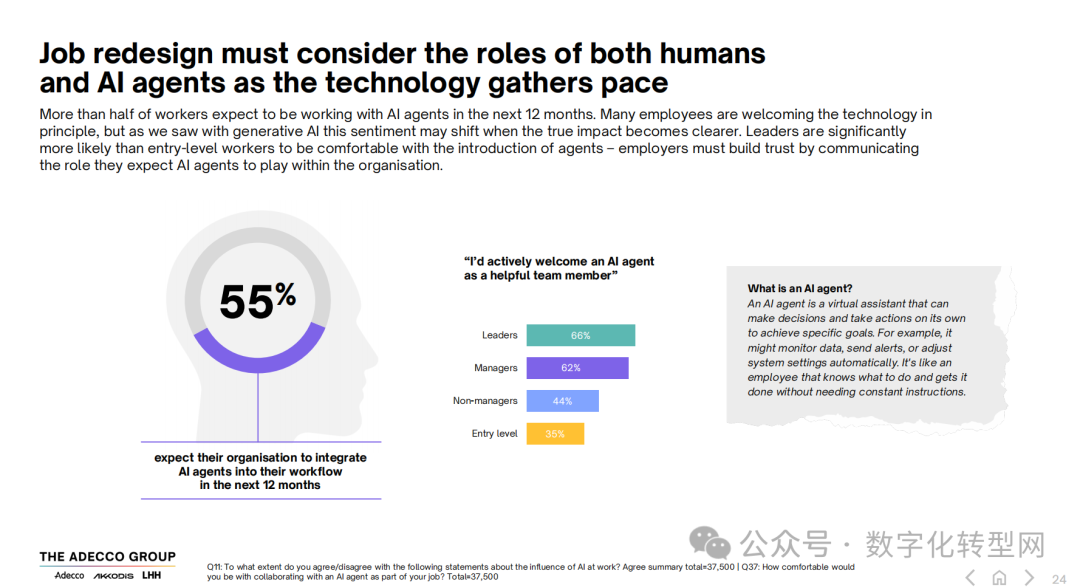 AI Agents的普及正在加速,55% 的劳动者预计未来12个月内,雇主企业将把 AI Agents整合到工作流程中。AI Agents被定义为能够自主决策和执行特定目标的虚拟助手,可自动监控数据、发送警报或调整系统设置等。但不同层级劳动者对 AI Agents的接受度差异显著:66% 的领导者、62% 的管理者愿意将其视为有用的团队成员,而普通员工和入门级员工的这一比例仅为 44% 和 35%。
