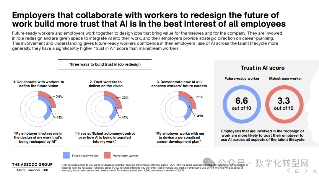 信任是AI时代工作重塑的核心基石,而人际连接是构建信任的关键。“未来就绪型劳动者” 的AI信任得分为 6.6 分(满分10分),是普通劳动者(3.3 分)的两倍。这一差距源于他们更深度地参与工作重塑:41% 的 “未来就绪型劳动者” 表示雇主会让他们参与 AI 驱动的工作设计(普通劳动者为 24%),41% 拥有 AI 整合的自主权(普通劳动者为 25%),41% 会与雇主共同制定个性化职业发展计划(普通劳动者为 25%)。
