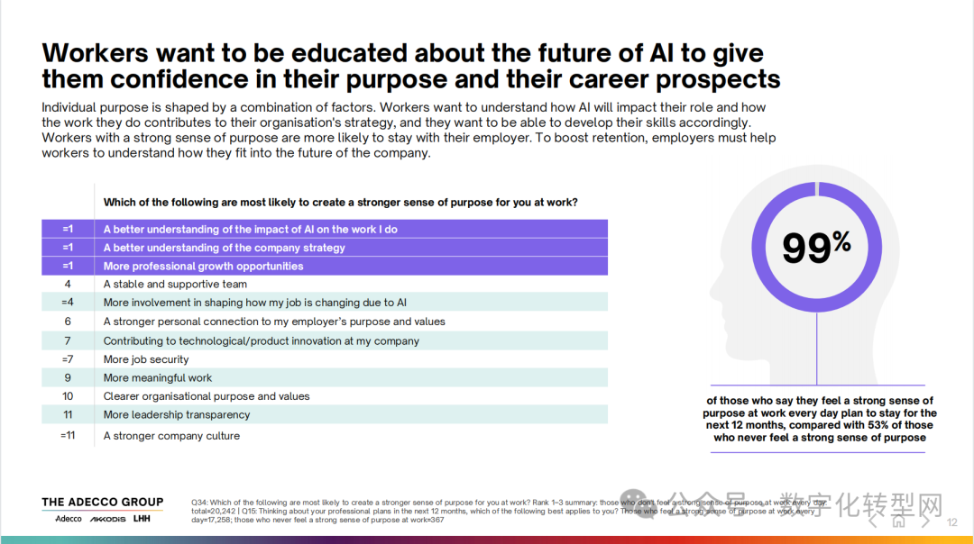 ● 目标与信任是核心支柱:即便 44% 的员工存在隐私顾虑,但那些清楚了解 AI 对自身岗位影响、知晓工作与公司战略关联的员工,留任意愿显著更高。