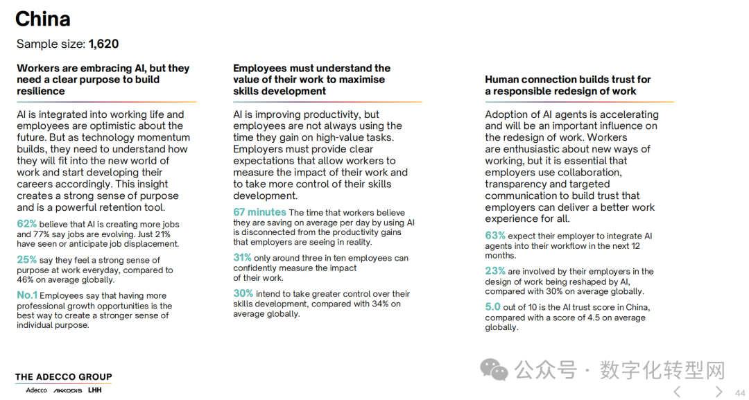 1、中国企业的员工对AI接纳度高但使命感待强化